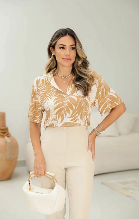 Camisa em viscose plana estampada com manga curta e gola sem botões, modelagem ampla e fluída com barra arredondada.
